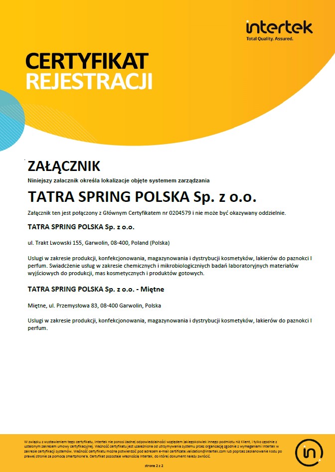 Certyfikat ISO 22716 wersja 2007 dla Tatra Spring Polska